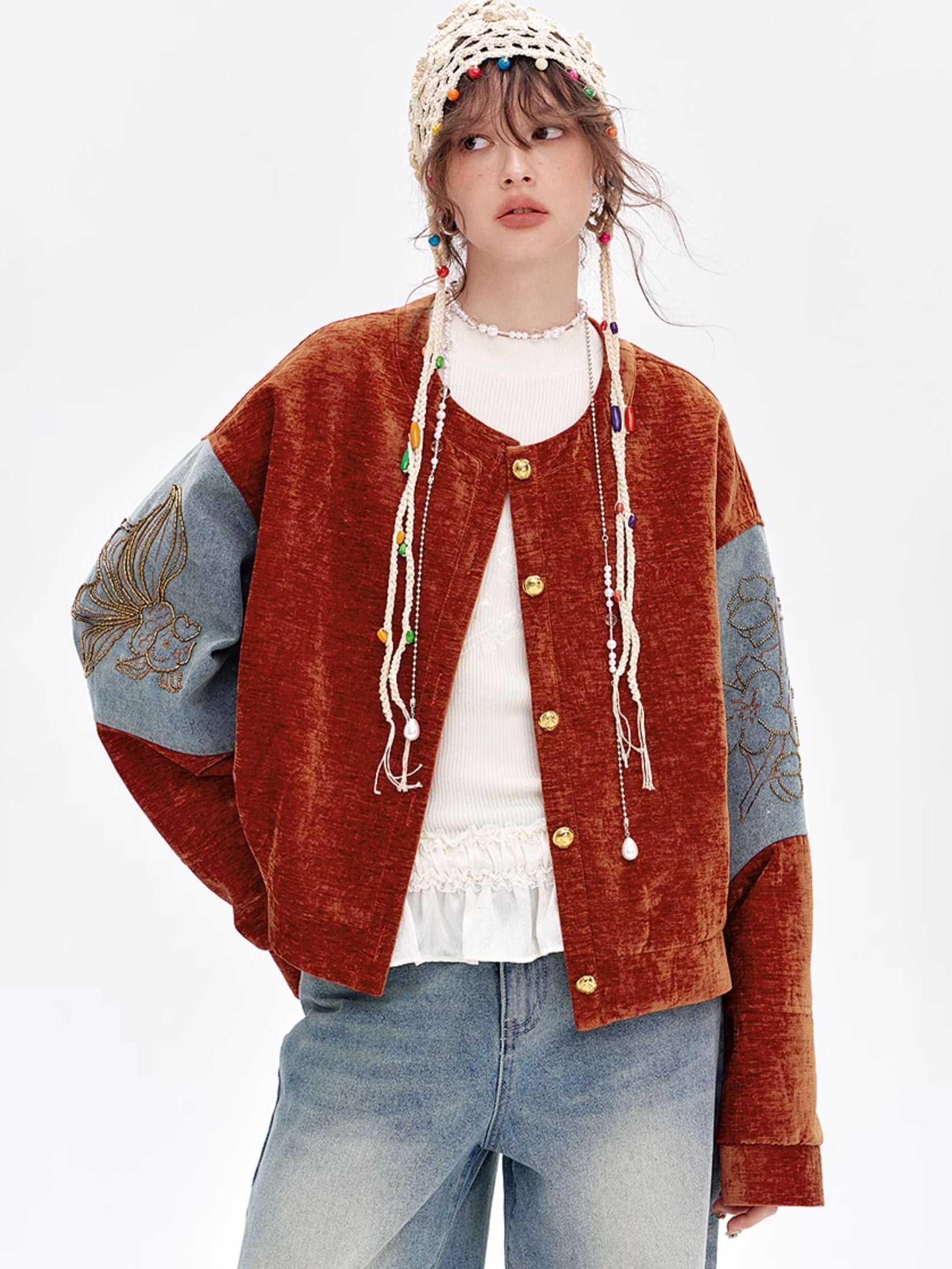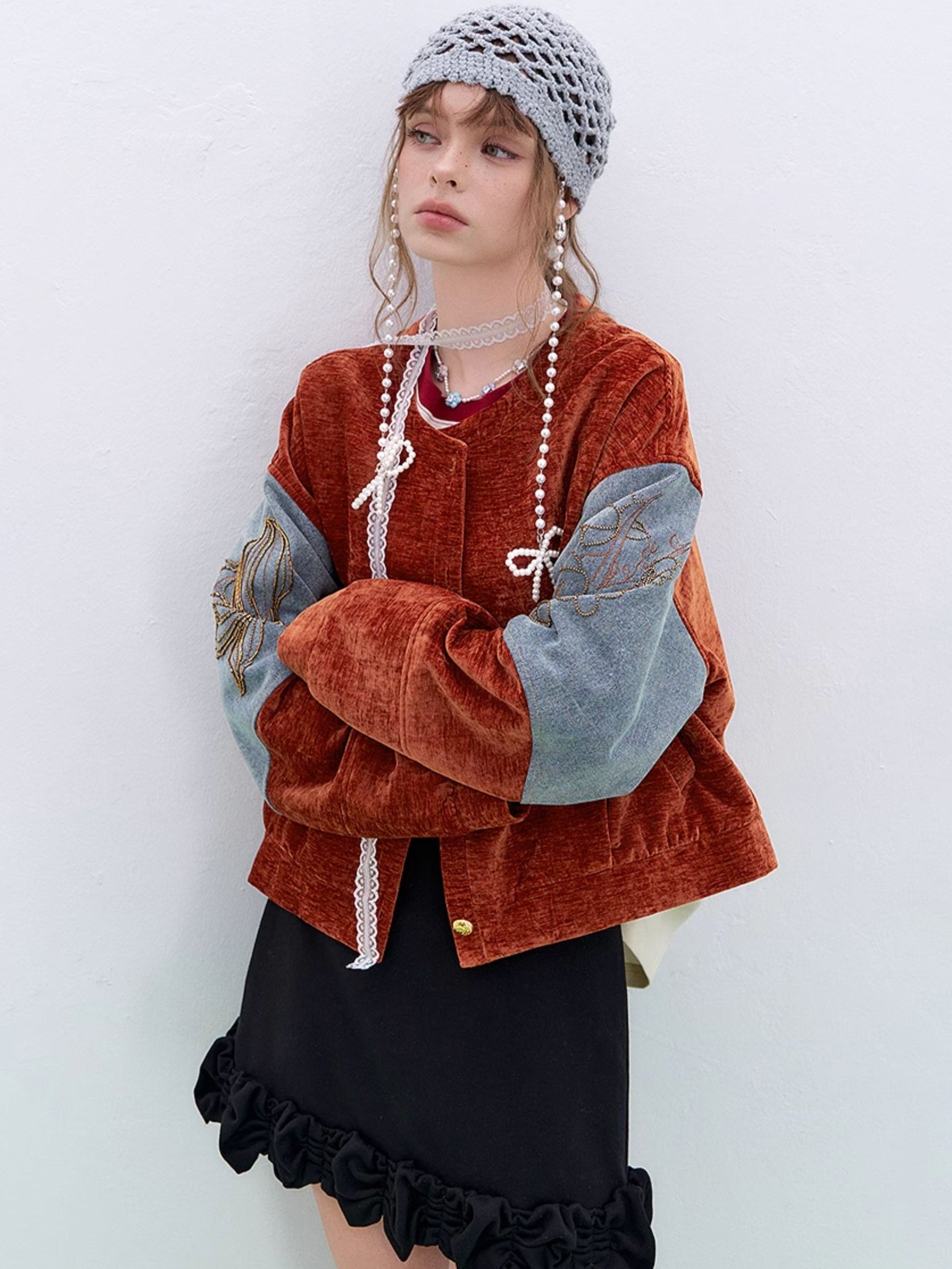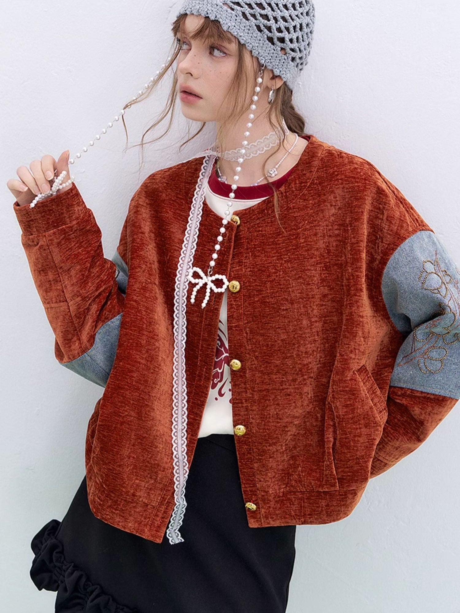 - ・起毛感のあるベロアタッチのボディにデニム調スリーブを切替えたドッキングデザイン