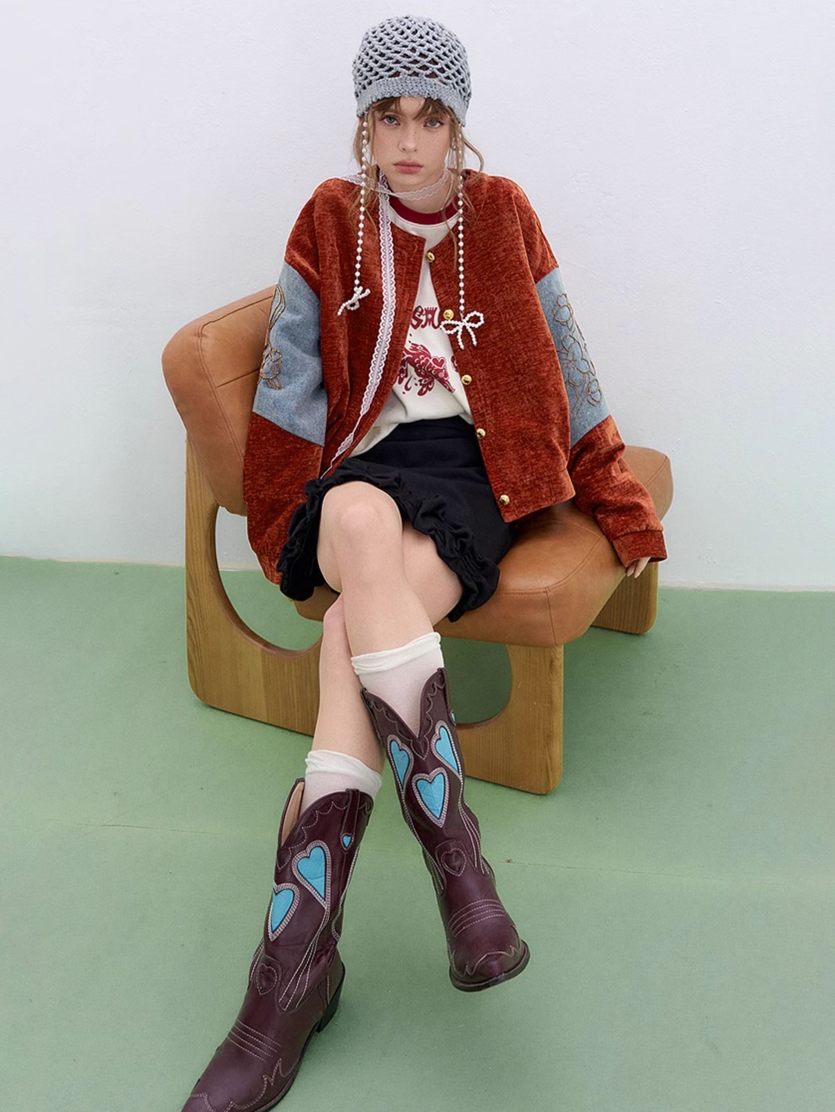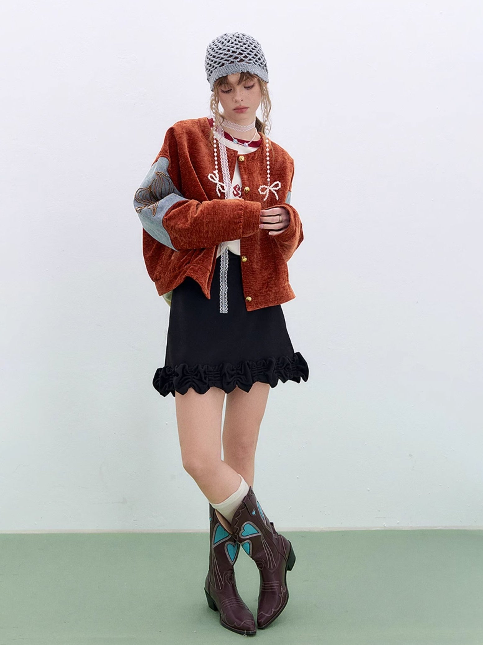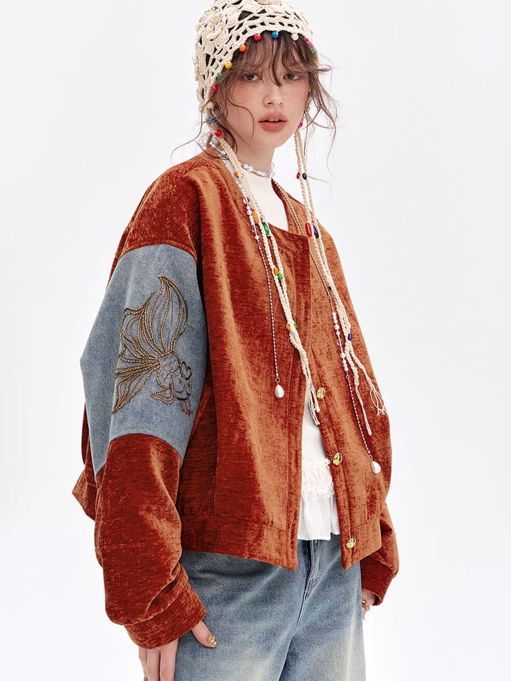 - ・起毛感のあるベロアタッチのボディにデニム調スリーブを切替えたドッキングデザイン